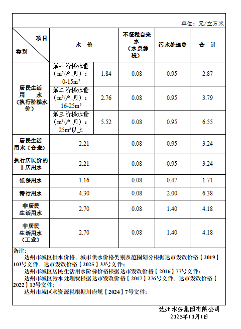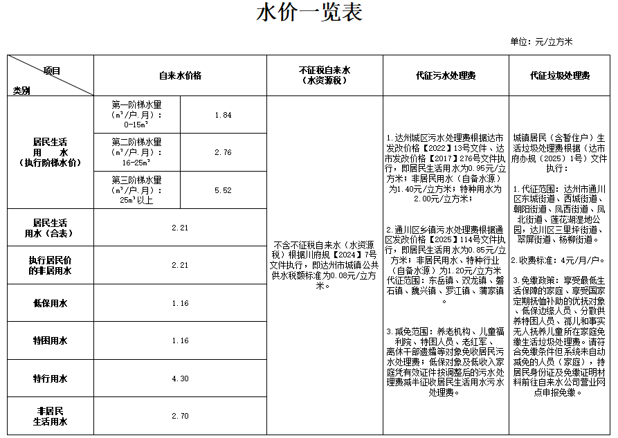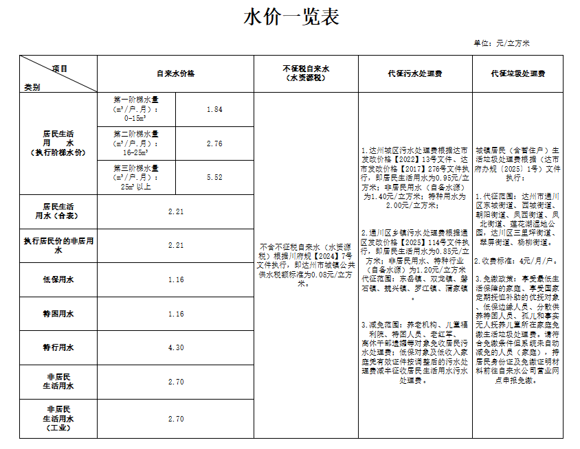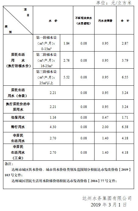 達州市城鎮(zhèn)供水銷售價格一覽表