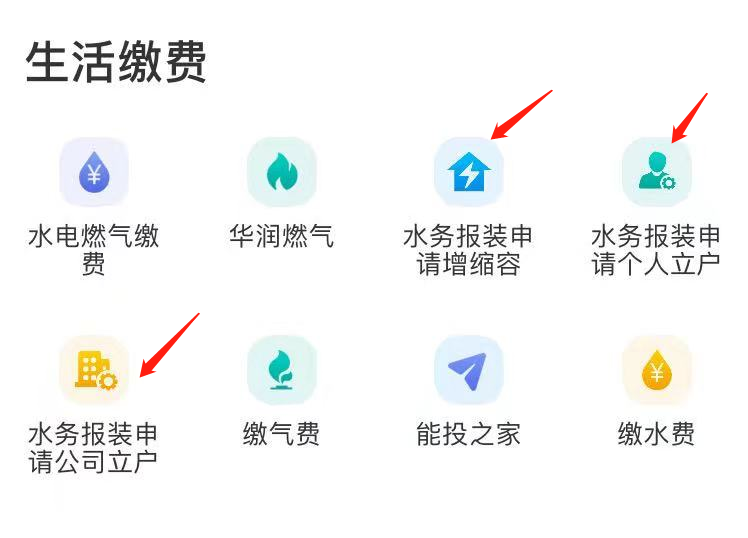 六、根據(jù)需要點(diǎn)擊下方的水務(wù)報(bào)裝申請(qǐng)(立戶申請(qǐng)、立戶查詢、增縮容申請(qǐng)、增縮容查詢)、水費(fèi)查詢