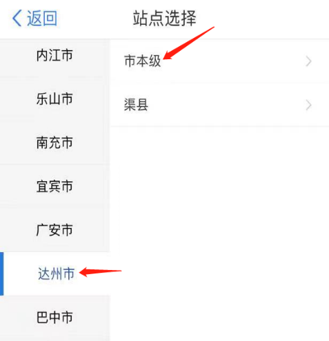 四、點(diǎn)擊右上方的地位,定位“達(dá)州市”,站點(diǎn)選擇達(dá)州市“市本級(jí)”